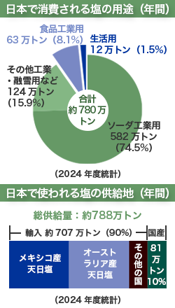 一年間に日本で消費される塩は、およそ780万トン。ですが、そのうち食用(生活用・家庭用食塩から味噌・醤油など加工食品全てを含む)は10%足らず。残りの90%以上はソーダ工業用など食用以外の用途です。日本で使われている塩は「食べない」用途の方が圧倒的に多いのです。