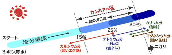 一方、「だけを採ろうとする一般の天日塩作り」では、だけを採るため、つまり、カルシウム分・カリウム分・マグネシウム分が含まれないようにするためにこの原理を使います。例えば、カルシウム分が析出を終えた25%から塩を採り始め、また、27〜28%以降とともに含まれるカリウム分・マグネシウム分は、よりも溶けやすい性質を使って、「塩を洗う」ことで落とします。その具体的な製造工程については、下の【参考ページ】をご覧ください。