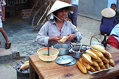 ベトナムでは、カンホアのような田舎でも容易にバゲットにありつけます。バゲットに目玉焼き、そして上のコーヒーは定番の朝食メニューですが、一番多いバゲットの食べ方はサンドイッチ。左の写真は、そのサンドイッチ屋さんです。はさむのは肉類や魚の練り物などにハーブの類。ヌクマム(魚醤)や甘辛いソースの味付けです。「具は、コレとコレ」などと指差せば、お好みにアレンジしてくれます。女性の右手下にある七輪であぶってくれ、アツアツのサンドイッチのでき上がりです。
