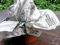 瓶の中の梅の天面をだいたい平らにした後、押し蓋をのせ、押し蓋で梅を軽く擦りながら、より平らにします。そして重石(2〜4kg)をなるべく偏らないようにのせ、容器に蓋をします。このとき、大概は重石で盛り上がってその容器の蓋が出来ないことが多いです。そんなときは、新聞紙などで重石ごと覆うように蓋をして容器にかぶせ、ヒモで軽くしばります。(右写真) 冷暗所に置きましょう。これでひと落ち着き。梅から出る汁が出始めるまで、梅の熟度によって1〜3日ですが、その間、中を覗き、重石が偏っていたら、のせ直してあげます。