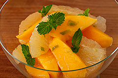 夏に出回る甘く香り高いフルーツで作るのがオススメ。青唐辛子と塩で和えたフルーツサラダです。