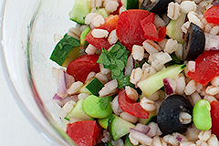 プチプチした食感が人気のもち麦と夏野菜をサラダにしました。