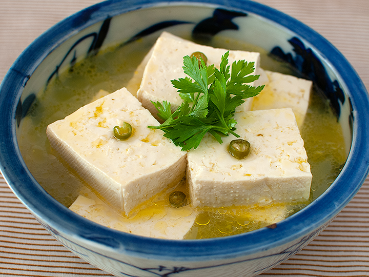 おでんのように、豆腐がしっかり塩水に 浸かった状態で加熱するのがポイントです