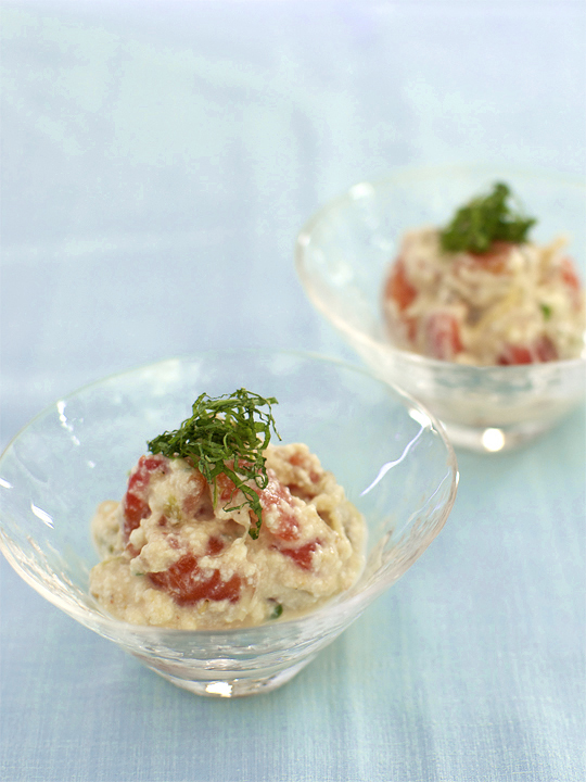 home > カノウユミコ・塩料理レシピ集 TOP > 3.サラダ・漬物・和え物 > トマトとみょうがの白和え