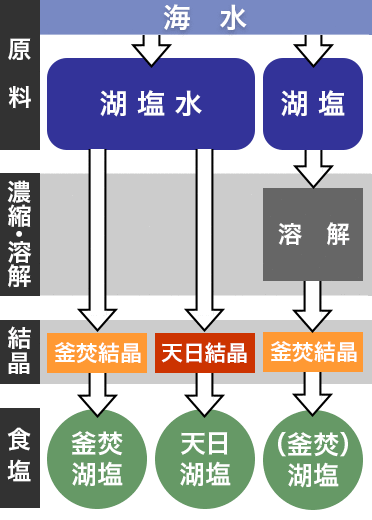 この「(釜焚)湖塩」は、すでに塩として出来上がっている「湖塩」を原料に、一度溶かして『濃い塩水』を作り、それを釜で焚いて結晶させた食塩です。「湖塩」はそのままでも塩ですですから、「溶解」して再結晶させる必要もないように思えますが、「湖塩」は長い時間露天で濃縮された湖塩水が結晶しているため、通常夾雑物が多く、食用にするには一度「溶解」して夾雑物を除く場合が多いのです。そのため、ここでは、「溶解」して「釜焚結晶」させた「(釜焚)湖塩」を例に挙げています。ちなみに「湖塩」を「溶解」せずにそのまま食塩としたものは、自然現象とは言え天日だけの結晶なので、「天日湖塩」(原料:湖塩 工程:なし)になります。