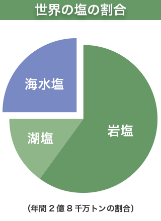 現在、世界中で1年間に生産される塩は、約2億8千万トン。そのうち、海水塩は、約4分の1で、残りは岩塩や湖塩など海水以外から作られています。日本で塩と言えば、「海水から作る」が常識的ですが、世界では比較的珍しいと言えます。岩塩の方が一般的な欧米では、“sea salt(海水塩)”の方が“rock salt(岩塩)”より珍重されています。ときどき欧米の食品で“sea salt”とパッケージで謳っている商品がありますが、それはそのため。3.4%の塩分濃度の海水を濃縮して塩を作るより、もう塩になっている岩塩の採掘を塩作りのスタートにした方が低コストです。また、世界の塩の歴史としても岩塩の方が古く、海水塩は岩塩の入手が困難な海辺の人たちが作り始めたと言われています。