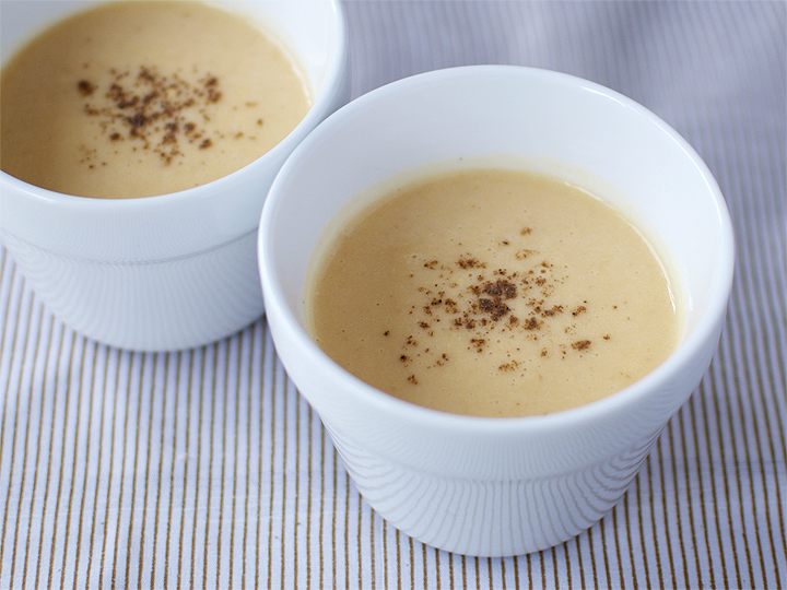 甘酒をプラスした甘〜いポタージュは、ほっとするおいしさです。カンホアの塩できりりと味をひきしめるのがポイントです。手に入れば、オールスパイスパウダーを少しふりかけると上質な味わいになります。