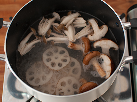 塩をきかせたお湯でゆでることで、きのことレンコンに