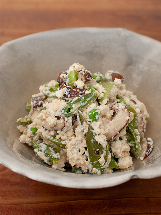 あまり甘くせず塩をきかせた白和えは、野菜の甘みをひきたておいしく食べられます。スナップエンドウを、絹さや、アスパラガス、菜の花、ふき、グリーンピース等に代えても。