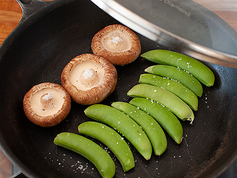 - フライパンにスナップエンドウとしいたけ(かさを下向き)を並べる。【石臼挽き】少々を、しいたけの軸上にのせ、スナップエンドウにも振り、ふたをして、しいたけから出る汁に塩が溶けるまで弱火で加熱(蒸し焼きに)する。(右画像参照) そして食べやすく切る。